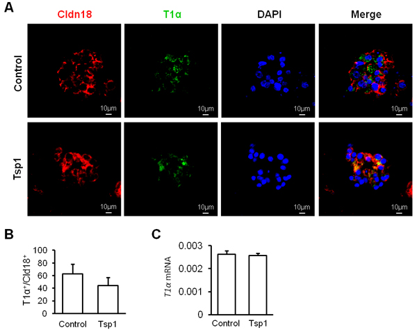 Figure 4: Tsp1 exhibits little effect on mouse AT2 cell differentiation. A. Representative images of immunostaining of paraffin section of AT2 cell cultures with Claudin 18 (Cldn18) and T1α. B. The percentage of T1α+ AT1 cells over Cldn18+ alveolar epithelial cells from AT2 colonies (n = 15) was summarized. C. T1α mRNA expression was determined in matrigel cultures of mouse AT2 cells. Three independent experiments were conducted.