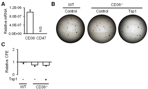 Tsp1 was shown to exert regulatory roles through surface antigens CD36 and CD47 [17]. Quantitative analysis of RNA isolated from sorted AT2 cells indicated that CD36 mRNA, but not CD47 mRNA, is expressed in mouse AT2 cells (Figure 5A). To evaluate the role of CD36 in AT2 cell function, AT2 cells were sorted from Cd36-/- mice and then co-cultured with MLg cells in the presence or absence of Tsp1 (Figure 5B). We observed no difference in CFEs of AT2 cells between cultures with Tsp1 and cultures without Tsp1 (Figure 5C). Cd36-/- AT2 cells exhibited comparable CFEs to CD36+/+ AT2 cells (Figure 5B and 5C). These data suggested that CD36 deficiency abrogated the Tsp1 promotion of mouse AT2 proliferation.