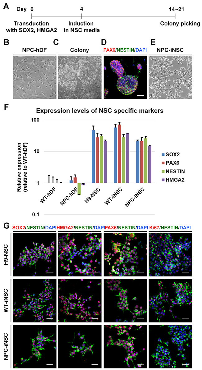 Figure 1: Direct conversion of NPC-iNSCs through the transduction with SOX2 and HMGA2. (A) Schematic timeline of generation of hDFs into iNSCs. (B-E) Shown are phase-contrast images of NPC patient-derived hDFs (B), colonies transduced with SOX2 and HMGA2 (C) and NPC-iNSCs (E), scale bar = 100 μm. Additionally, an immunocytochemistry analysis of colonies stained with antibodies against PAX6 and NESTIN is shown (D). Nuclei were counterstained with DAPI, scale bar = 50 μm. (F) Relative gene expression levels of NSC-specific markers (SOX2, PAX6, NESTIN, and HMGA2) were analyzed in NPC-hDFs, H9-NSCs, WT- and NPC-iNSCs in comparison to WT-hDFs, whose expression is considered to be 1 for all genes. (G) Immunocytochemistry analysis of NSC-specific marker expressions was performed in H9-NSCs, WT- and NPC-iNSCs using antibodies against SOX2, HMGA2, PAX6 and NESTIN as well as proliferating marker Ki67. Nuclei were counterstained with DAPI, scale bar = 50 μm.