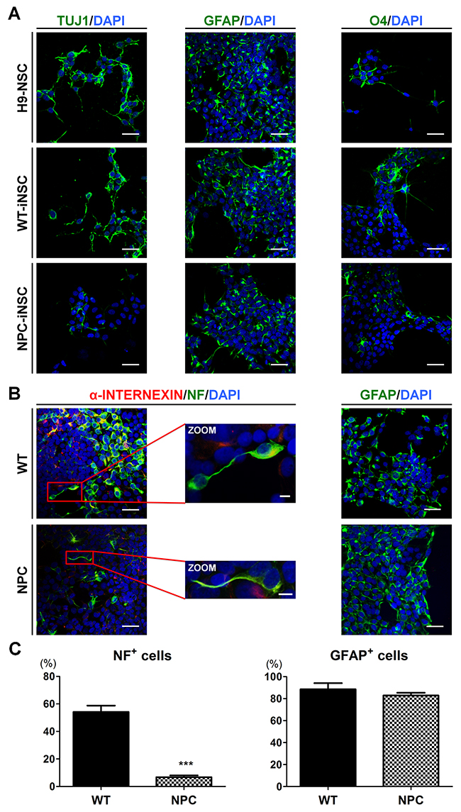 Figure 2: Defective neuronal differentiation of NPC-iNSCs. (A) Representative images showing neurons, astrocytes and oligodendrocytes, differentiated from H9-NSCs, WT- and NPC-iNSCs, as indicated by TUJ1, GFAP, and O4 expression. Nuclei were counterstained with DAPI, scale bar = 50 μm. (B) Immunocytochemistry analysis of differentiated cells from WT- and NPC-iNSCs into neurons (α-INTERNEXIN and NF) and astrocytes (GFAP). Nuclei were counterstained with DAPI, scale bar = 50 μm, zoom scale bar = 10 μm. For the quantification in (C), NF- and GFAP-positive cells were counted and were expressed as the percentage of the total number of cells, which were counterstained with DAPI, scale bar = 50 μm. ***P < 0.005.