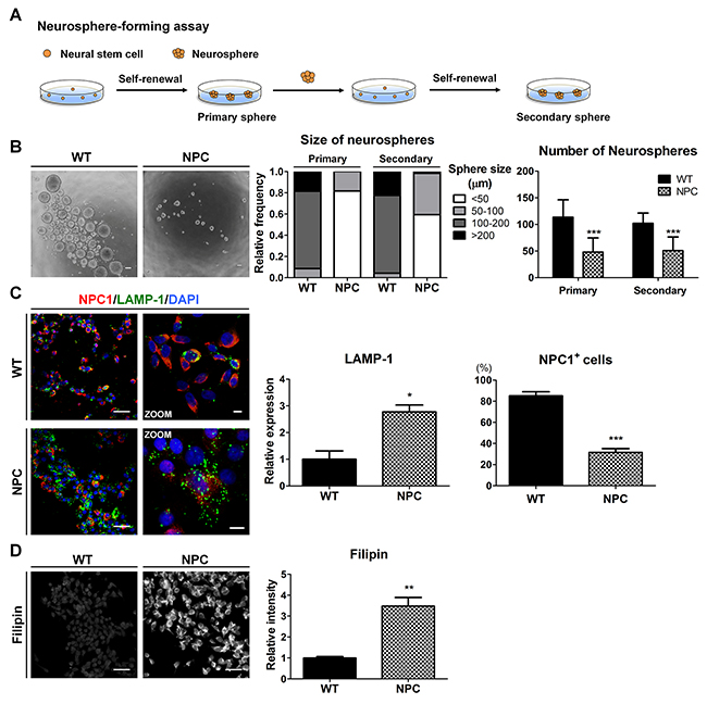 Figure 3: NPC-iNSCs display disease-specific phenotypes of NPC disease. (A) Scheme of neurosphere-forming assay. (B) Phase-contrast images of the WT- and NPC-neurospheres (left), scale bar = 100 μm. Self-renewal ability is characterized by the diameter (middle) and number (right) of primary and secondary neurospheres. (C) WT- and NPC-iNSCs were stained with antibodies against NPC1 and LAMP-1. Nuclei were counterstained with DAPI,scale bar = 50 μm, zoom scale bar = 10 μm. The quantification of NPC1-postivie cells was conducted following the same method used in Figure 2C. The expression levels of LAMP-1 was measured using Image J software and the value of control is set at 1. (D) Unesterified cholesterol of WT- and NPC-iNSCs was detected by filipin staining, scale bar = 50 μm. *P < 0.05, **P < 0.01, ***P < 0.005.