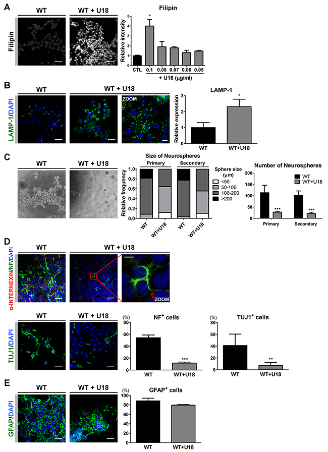 Figure 4: U18 treatment leads to impairments of self-renewal and neuronal differentiation in WT-iNSCs through abnormal cholesterol accumulation. (A) Representative filipin staining results indicates that U18 treatment induced cholesterol accumulation, compared to non-treated WT-iNSC, scale bar = 50 μm. U18 was treated at various concentration to determine the appropriate concentration. The intensity of filipin was analyzed and quantified. (B) U18-treated WT-iNSCs were stained with antibody against LAMP-1 and quantified using the same method as in Figure 3C, scale bar = 50 μm, zoom scale bar = 10 μm. (C) Phase-contrast images of the control- and U18-treated WT-neurospheres, scale bar = 100 μm (left). Self-renewal ability of U18-treated WT-neurosphere was characterized by the size (middle) and number (right) of neurospheres. (D) After U18 treatment, WT-iNSCs were differentiated into neurons (α-INTERNEXIN, NF, and TUJ1). Nuclei were counterstained with DAPI, scale bar = 50 μm, zoom scale bar = 10 μm. (E) U18-treated WT-iNSCs and non-treated WT-iNSCs were differentiated into GFAP-positive astrocytes. Nuclei were counterstained with DAPI, scale bar = 50 μm. Differentiation capacity into neurons (D) and astrocytes (E) was quantified using the same method as in Figure 2C. *P < 0.05, **P < 0.01, ***P < 0.005.