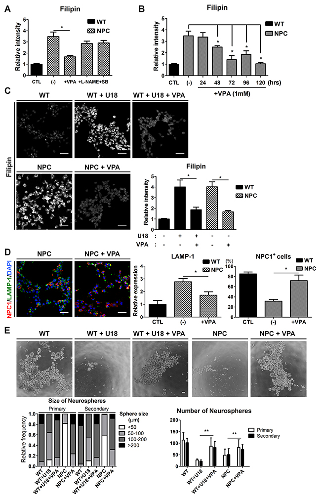 Figure 5: Rescue of cholesterol accumulation and self-renewal ability by VPA treatment. (A) NPC-iNSCs were treated with VPA (1mM), L-NAME (100μM), and SB202190 (1μM) for 3 days. (B) VPA was treated to NPC-iNSCs at various incubation time. The relative intensity of filipin was analyzed and normalized to WT-iNSCs. (C) VPA treatment had effect on reduction of cholesterol accumulation in U18-treated WT- and NPC-iNSCs, scale bar = 50 μm. (D) VPA-treated NPC-iNSCs were stained with NPC1 and LAMP-1, scale bar = 50 μm. The quantification in (D) was conducted following the same method as in Figure 3C. (E) Analysis of neurosphere formation after VPA treatment. Impaired self-renewal ability was rescued by VPA treatment, scale bar = 100 μm. *P < 0.05,**P < 0.01.