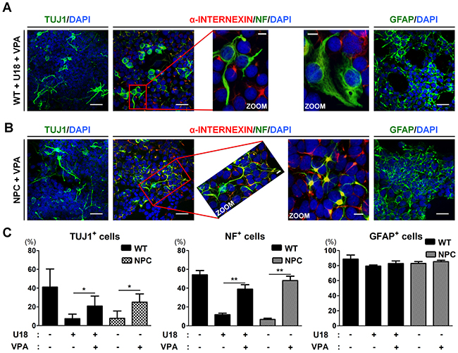 Figure 6: VPA treatment partially rescues the neuronal differentiation in NPC-iNSCs. (A-B) Representative images of α-INTERNEXIN-, NF-, TUJ1-, and GFAP-positive cells differentiated from U18-treated WT-iNSCs (A) and NPC-iNSCs (B) after VPA treatment, scale bar = 50 μm, zoom scale bar = 10 μm. (C) The quantification was conducted following the same protocol of Figure 2C. *P < 0.05, **P < 0.01.