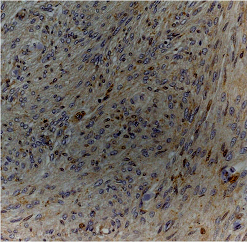 Figure 3: Atypical meningioma (grade II) with weak cytoplasmic staining for Dkk3 (Dkk3 stain; original magnification, x200).