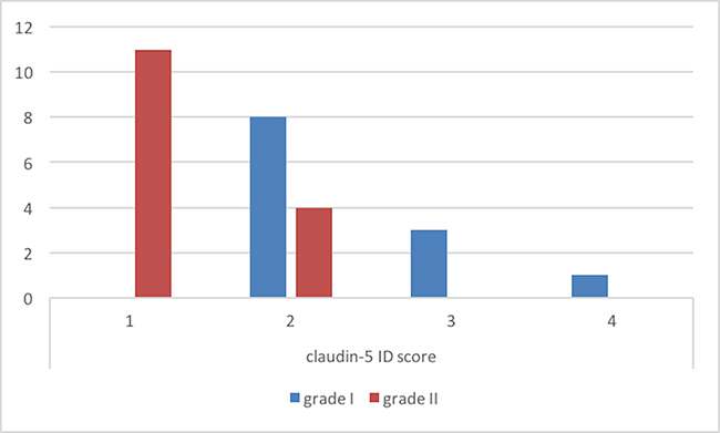 ID score for claudin-5 was 2 in 8, 3 in 4 and 4 in 1 grade I meningiomas (Figure 4). On the other hand, among grade II meningiomas, 11 cases had claudin-5 ID score 1 and 4 cases had ID score 2 (Figure 4). In all meningiomas, staining was cytoplasmic (Figure 5). These results were confirmed by immunohistochemistry that revealed a slight immunoreactivity for Dkk-3 protein in meningiomas, compared with control tissues. It was also highlighted an irregular positivity of claudin-5 protein, with vessel location, due to the alteration of its function, highlighting its role in maintaining the integrity of the barrier. Chi-squared test showed that lower Dkk-3 and claudin-5 ID score were significantly associated with histological grade II (P = 0,0427; P = 0,0006). No significant correlations were observed between Dkk-3 and claudin-5 ID scores and site or Simpson grade of the tumors. A trend towards correlation was evidenced between lower Dkk-3 or claudin-5 ID scores and recurrence; however statistical significance was not reached (P > 0,05).