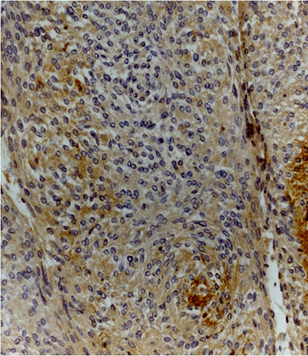 Figure 2: Transitional (grade I) meningioma showing moderately intense cytoplasmic and nuclear staining for Dkk3 (Dkk3 stain; original magnification, x200).