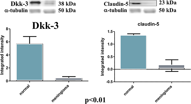 Figure 6: Evident decrease, at western blot analysis, of Dkk-3 and claudin-5 expression in the tissues of patients with meningiomas compared with control tissues. At statistical analysis, a significant difference (P < 0.05) was found in the expression levels of Dkk-3 and claudin-5.