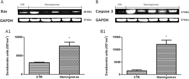Figure 7: A significant increasing of pro-apoptotic proteins (Bax and Caspase 3) expression was observed in the tissue from meningiomas patients compared to control (A and B respectively, see densitometric analysis A1 and B1 respectively). Data show two representative blot from three independent experiments with similar results. Data are expressed as Mean ± SEM from N = 30 patients. P < 0.01 vs. CTR.