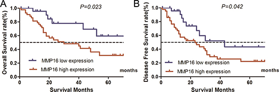 Figure 2: Influence of MMP16 expression patterns on overall survival and disease free survival by Kaplan-Meier analyses in the validation cohort. (A) OS: χ2 = 5.172, P = 0.023; (B) χ2 = 4.119, P = 0.042.