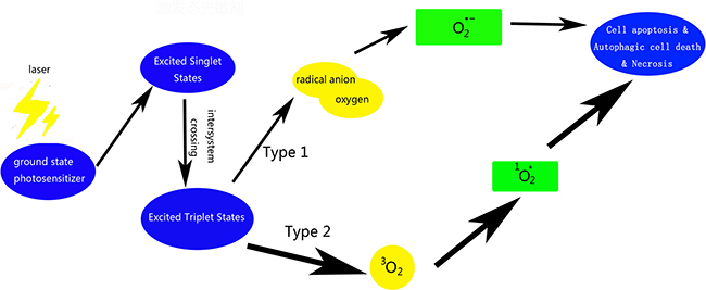 PDT has three functional elements: photosensitizer, optical wavelength of light and molecular oxygen [6]. The fundamental biological reaction in PDT involves absorption of light energy by the photosensitizers and its subsequent transfer to induce chemical alteration [7–9].