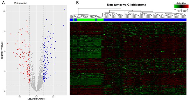 Figure 1: Differentially expressed lncRNAs (DELs) analysis between glioblastomas and non-tumor controls. (A) Volcano plots of the DELs, consisting of 81 up-regulated and 82 down-regulated lncRNAs. (B) Clustering and heat-map of DELs, up-regulated lncRNAs are clustered in the magenta-shaded areas, and the green-shaded areas indicate down-regulated lncRNAs. Dendrogram reflect relationship among samples; the blue bars consist of glioblastoma samples and green bars indicate non-tumor controls.