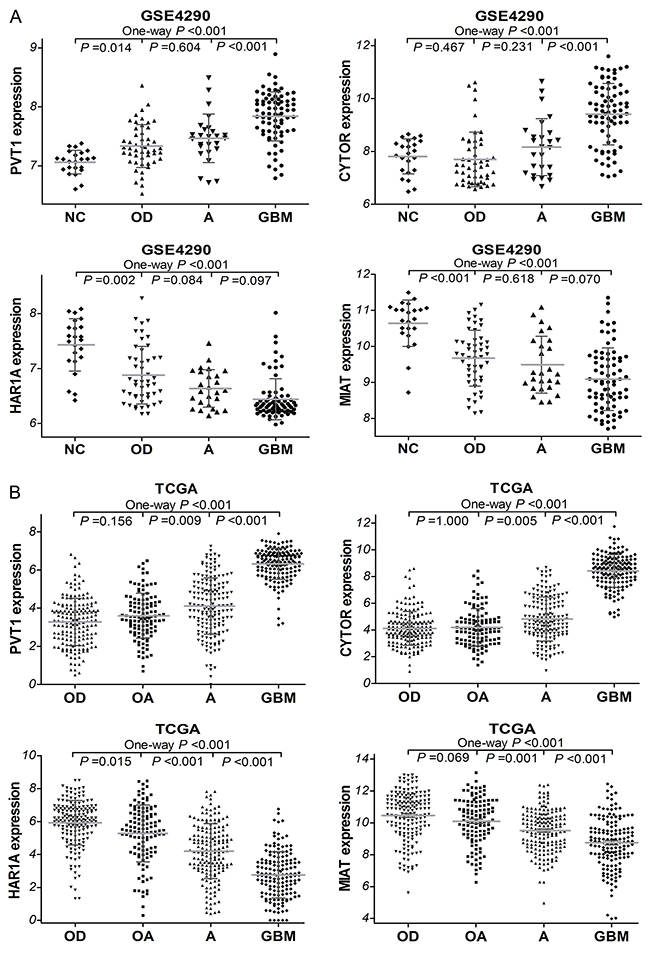 Figure 2: The expression of PVT1, CYTOR, HAR1A and MIAT in glioma samples of GSE4290 (A) dataset (50 of OD, 26 of A, 77 of GBM, and 23 of NC) and TCGA (B) dataset (175 of OD, 115 of OA, 170 of A, and 152 of GBM). OD, oligodendroglioma; OA, oligoastrocytoma; A, astrocytoma, GBM, glioblastoma.