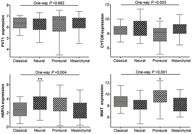 Figure 3: Box-plot of the PVT1, CYTOR, HAR1A and MIAT expressions in the classical, neural, proneural and mesenchymal subtypes of glioblastoma samples within TCGA. * means P<0.05, ** means P<0.01.