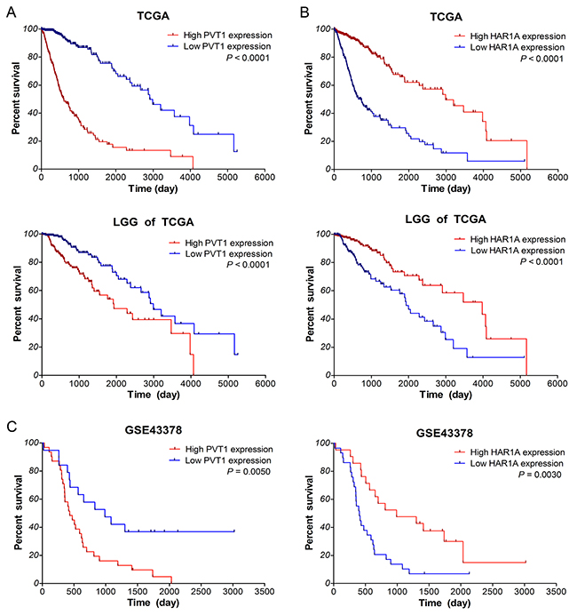 Figure 4: Up-regulated PVT1 and down-regulated HAR1A correlate with poor overall survival of glioma patients. Kaplan–Meier survival curve analyses with a log-rank comparison were performed based on PVT1 (A) and HAR1A (B) expression in gliomas samples of TCGA along with LGG subtypes, and gliomas samples of GSE43378 (C) datasets.