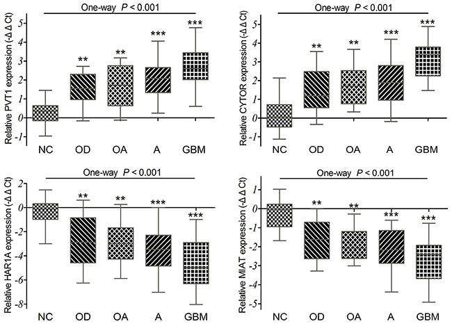 Figure 5: The qRT-PCR analysis of relative PVT1, CYTOR, HAR1A and MIAT expressions in 98 diffuse glioma specimens and 12 non-tumor brain tissues (NC). P =0.002 for PVT1, P <0.001 for CYTOR, P =0.002 for HAR1A, P =0.008 for MIAT between OD and GBM. P =0.015 for PVT1, P =0.002 for CYTOR, P =0.016 for HAR1A, and P =0.044 for MIAT between OA and GBM. P =0.011 for PVT1, P <0.001 for CYTOR, P =0.009 for HAR1A, and P =0.054 for MIAT between A and GBM.