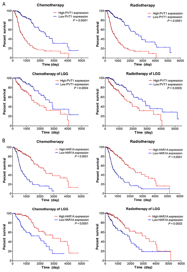 Figure 6: Kaplan–Meier survival analysis of patients who received chemotherapy or radiotherapy in gliomas samples of TCGA along with LGG subtypes based on the expression of PVT1 (A) and HAR1A (B). The P-values were computed by the log-rank test.
