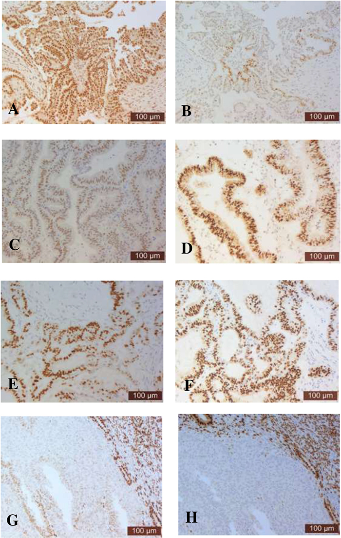 Figure 1: Representative immunohistochemistry images showing the immunostaining of ER and PR in serous (A-B), mucinous (C-D), endometrioid (E-F) or clear cell (G-H) carcinoma of ovarian cancer.