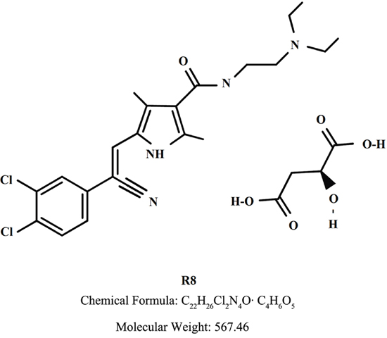 In this study, we observed the inhibition of a novel MKI R8 on cancer cells in vitro, with comparison to Sunitinib, one of the widely used MKIs in clinic, and explored the possible mechanism by which R8 took effect. As a class III/V multikinase inhibitor, Sunitinib was reported to suppress various kinds of tumors, such as human metastatic renal cell carcinoma, lung carcinoma, glioblastoma, melanoma [12–15] by inhibiting the activation of VEGFR-1, 2 and 3, PDGFR-α, β, Kit, Flt3 and RET. It has been approved by FDA to treat advanced renal cell cancer and imatinib mesylate-intolerant or resistant gastrointestinal stromal tumor since 2006 [16, 17].