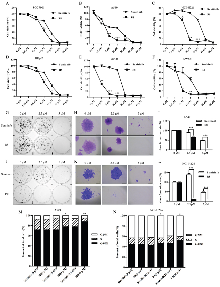Figure 2: R8 significantly inhibited cell proliferation and colony formation than Sunitinib. (A, F) Cell viability was detected by CCK-8 assay after six cell lines treated with Sunitinib or R8 for 48 h. (A) SGC7901, (B) A549, (C) NCI-H226, (D) HEp-2, (E) 786-0, (F) SW620. (G, J) R8 treatment of A549 (G) and NCI-H226 (J) significantly decreased numbers of colonies than Sunitinib after 14 days culture at concentration of 2.5 μM and 5 μM. (H, K) Typical colony morphology of A549 (H) and NCI-H226 (K) generated from single cell. Scale bar=20 μm. (I, L) Colony formation rate analysis of A549 (I) and NCI-H226 (L) treated with Sunitinib or R8. (M, N) Higher G0/G1 phase cell cycle arrest was induced after A549 and NCI-H226 cell lines treated with R8 for 24 h than Sunitinb. Data were presented as means ± SD of three independent experiments (* P<0.05, ** P<0.01, *** P<0.001).