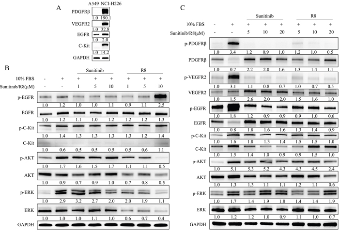 Figure 4: R8 significantly inhibited phosphorylation of receptor tyrosine kinases and down-stream AKT than Sunitinib in a dose-dependent manner. (A) Comparison of expression level of PDGFRβ, VEGFR2, EGFR, C-Kit between A549 and NCI-H226 cell lines. All samples were 30 μg/well, except for EGFR (20 μg/well). (B) A549 cell line was incubated with various concentration of R8 or Sunitinib for 1 h, western blot analyzed phosphorylated EGFR, C-Kit, AKT, ERK after stimulation. (C) NCI-H226 cell line was incubated with various concentration of R8 and Sunitinib for 1 h, western blot showed phosphorylated PDGFRβ, VEGFR2, EGFR, C-Kit, AKT, ERK after stimulation. The protein densitometry values showed in the figure were normalized to their respective house-keeping protein GAPDH.