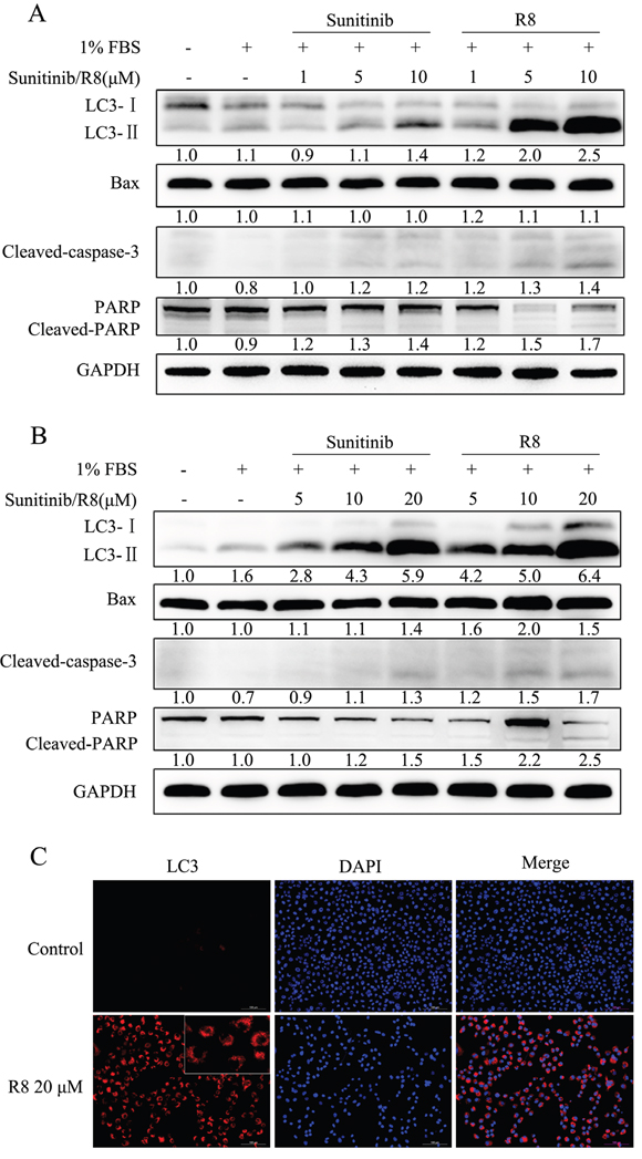 Figure 5: Strong autophagy was induced after A549 and NCI-H226 treated with high concentration of R8 for 48 h, as well as apoptosis. (A) A549 cell line treated with different doses of Sunitinib or R8 for 48 h, western blotting analysis of the level of Bax, LC3, cleaved- caspase-3, PARP. GAPDH was used as a loading control. Experiments were repeated for three times and the data showed the representative results. (B) Significant activation of apoptosis and autophagy of NCI-H226 cell line was observed via western blotting of Bax, cleaved- caspase-3, PARP and LC3-II after treated with different doses of R8 for 48 h, especially for the high concentration group. (C) Immunofluorescence of LC3 for NCI-H226 cell line treated with R8 for 48 h. Red-punctate fluorescence of LC3-II could be detected in the R8 20 μM treated group.