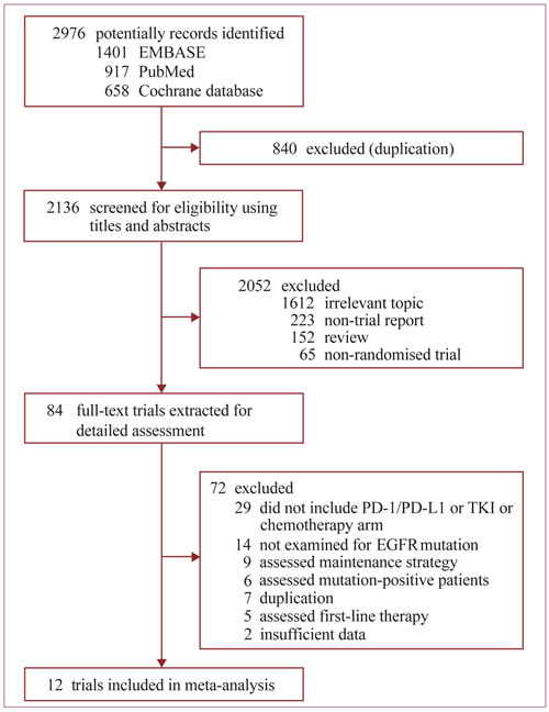 Of 2976 potentially records were initially identified by search strategy (Figure 1), 12 open-labeled, randomized Phase II/III trials accruing 6462 patients with advanced NSCLC were finally included in this meta-analysis (Table 1) [17-19, 24-33]. After excluding the patients who did not have a known EGFR mutation status, a total of 3341 patients bearing WT EGFR tumors were included. All trials enrolled patients aged > 18 years and had a histologically or cytologically confirmed diagnosis of NSCLC, with Eastern Cooperative Oncology Group or World Health Organization performance status of 0 to 2. All the four trials containing PD-1/PD-L1 antibody arm used FDA-approved dose. Three of them were performed in second- or third-line setting [24, 25, 27], the other one were second- setting [26]. All 12 trials containing chemotherapy arm used recommended drugs (single-agent docetaxel or pemetrexed is standard second- or higher- line treatment [12, 13]) with standard dosing schedule. All the 8 trials containing EGFR-TKI arm used standard dosing schedule (erlotinib, 150 mg orally daily; gefitinib, 250 mg orally daily). Among these trials, five were second-line setting [17, 19, 30, 32, 33], and three were second- or third-line setting [18, 28, 29, 31]. Five trials majorly comprised of white patients [17, 28-31, 33], while the other three majorly included Asian patients [18, 19, 32]. Four trials used only direct sequencing for EGFR mutation detection [19, 28-31], while the other four used more sensitive methods (amplification refractory mutation system, restriction fragment length polymorphism analysis, highly sensitive polymerase chain reaction or mass spectrometry) to enhance sensitivity [17, 18, 32, 33].