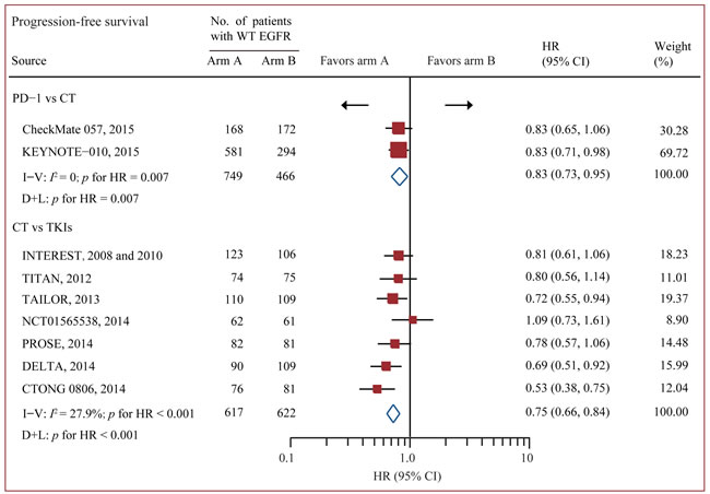 Figure 3: Pairwise comparisons for progression-free survival. Abbreviations: CI, confidence interval; CT, chemotherapy; WT EGFR, epidermal growth factor receptor; HR, hazard ratios; I-V = inverse variance. D+L = DerSimonan and Laird; PD-1, programmed death-1; PD-L1, programmed death-ligand 1; TKI, tyrosine kinase inhibitors; WT, wild-type.