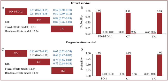 Figure 4: Indirect comparisons for overall survival. A. and B. and progression-free survival C. and D. The row treatment was compared with column treatment; Upper triangles (A and C) denote pooled hazard ratios (HRs) with 95% credible intervals; In each cell, the first and second line used fixed-effects and random-effects models; HRs with Bayesian p value < 0.05 are in blue. Histograms (B and D) are shown for cumulative probabilities of each treatment ranking first, second and third best based on fixed-effects models. Abbreviations: CT, chemotherapy; DIC, deviance information criterion; EGFR, epidermal growth factor receptor; PD-1, programmed death-1; PD-L1, programmed death-ligand 1; TKI, tyrosine kinase inhibitors; WT, wild-type.