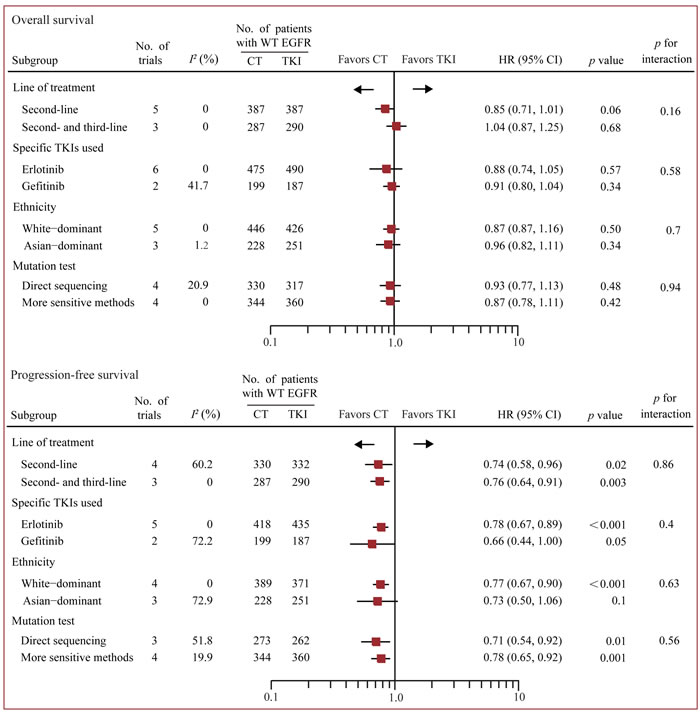 Figure 5: Subgroup analysis based on line of treatment, specific TKI used, ethnicity and method of EGFR mutation detection. Fixed-effects models were used when I2 < 50%, otherwise random-effects models were used. CT, chemotherapy; EGFR, epidermal growth factor receptor; TKI, tyrosine kinase inhibitors; WT, wild-type.
