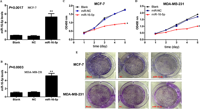 MiR-16-5p overexpression contributed to the inhibition of proliferation and colony formation ability in breast carcinoma cells