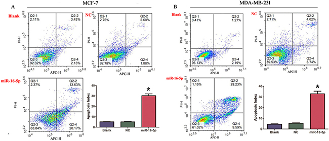 Figure 3: Overexpression of miR-16-5p induced cell apoptosis in MCF-7 cells and MDA-MB-231 cells. (A) miR-16-5p induced apoptosis of MCF-7 cells. (B) miR-16-5p induced apoptosis of MDA-MB-231 cells. *P < 0.05, compared with blank group and NC group.