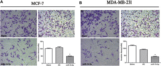 Figure 4: Overexpression of miR-16-5p suppressed cell invasion ability in MCF-7 and MDA-MB-231 cells. 5 × 10E4 of MCF-7 cells and MDA-MB-231 cells were seeded into transwell chamber. Invading cells was taken using microscopy system at 48 h. *P < 0.05, compared with blank group and NC group.