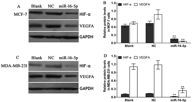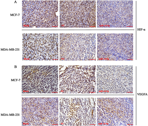 Overexpression of miR-16-5p reduced HIF-α and VEGFA expression in MCF-7 and MDA-MB-231 xenografts