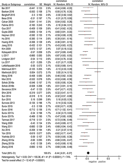 Figure 1: Forest plots of correlation coefficients between ADCmean and KI 67 in all involved studies (n = 42).