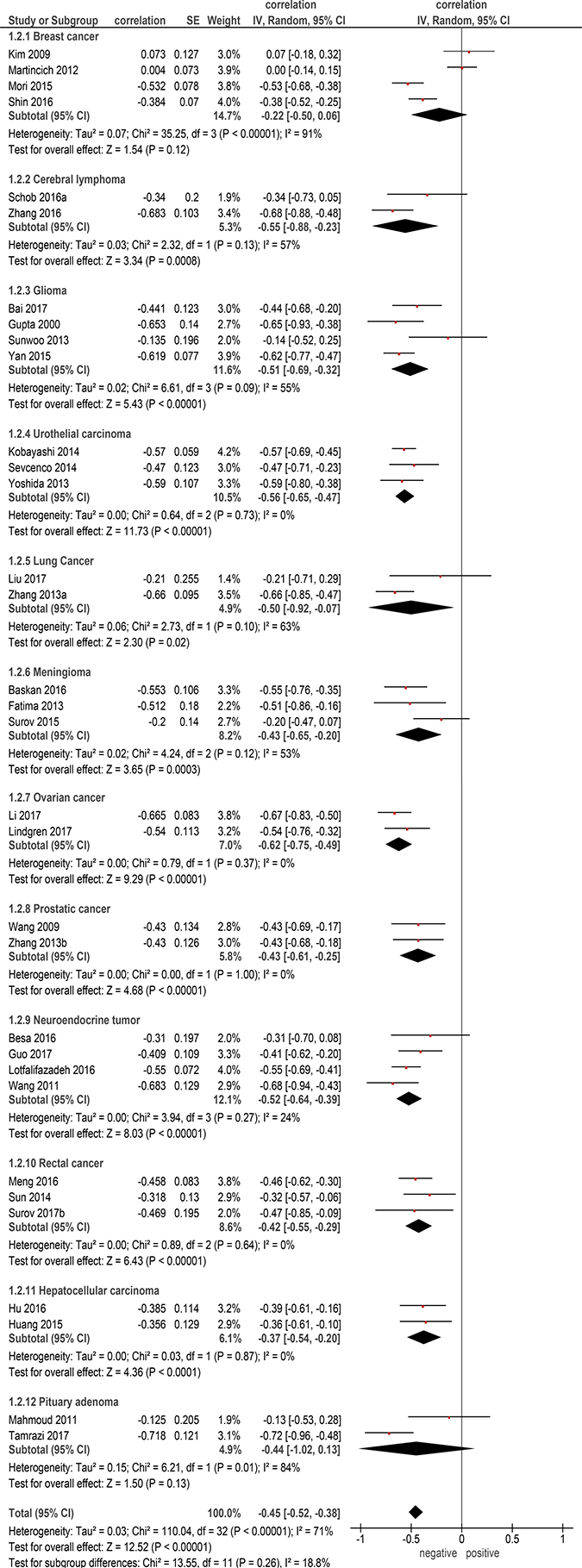Furthermore, correlation coefficient for every tumor entity was calculated. For this sub-analysis, only data for primary tumors were acquired and tumor entities with less than three reports were excluded. Overall, 12 tumor entities with 1778 patients were included into the sub-analysis (Table 2). The calculated correlation coefficients were as follows: ovarian cancer: ρ = −0.62 (95% CI = [−0.75; −0.49]); urothelial carcinomas: ρ = −0.56 (95% CI = [−0.65; −0.47]); cerebral lymphoma: ρ = −0.55 (95% CI = [−0.88; −0.23]); neuroendocrine tumors: ρ = −0.52 (95% CI = [−0.64; −0.39]); glioma: ρ = −0.51 (95% CI = [−0.69; −0.32]); lung cancer: ρ = −0.50 (95% CI = [−0.92; −0.07]); prostatic cancer: ρ = −0.43 (95% CI = [−0.61; −0.25]); rectal cancer: ρ = −0.42 (95% CI = [−0.55; −0.29]); pituitary adenoma:ρ = −0.44 (95% CI = [−1.00; 0.13]); meningioma, ρ = −0.43 (95% CI = [−0.65; −0.20]); hepatocellular carcinoma: ρ = −0.37 (95% CI = [−0.54; −0.20]); breast cancer: ρ = −0.22 (95% CI = [−0.50; 0.06]) (Figure 2).