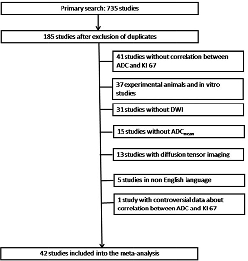 The strategy of data acquisition is shown in Figure 3. MEDLINE library was screened for associations between ADC and KI 67 in different tumors up to April 2017. The following search words were used: “DWI or diffusion weighted imaging or diffusion-weighted imaging or ADC or apparent diffusion coefficient AND KI 67 OR KI67 OR ki67 OR ki-67 OR mitotic index OR proliferation index OR MIB 1 OR MIB-1 OR mitosis index”. Secondary references were also recruited. The Preferred Reporting Items for Systematic Reviews and Meta-Analyses statement (PRISMA) was used for the research [66].
