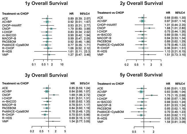 As concluded in the results mentioned above, CNOP and VMP are recognized as the least effective regimens. Third-generation chemo regimens ProMACE-CytaBOM performed relatively better on OS outcomes, although its superiority did not maintain in CR. As for CR, R-HDS possessed a significantly remarkable efficacy, regardless of its modest performance in respect of OS. Additionally, R-CHOP, a standard treatment for DLBCL in International Prognostic Index, ranked top in 3 year- and 5 year-OS, which indicates its value in achieving greater long term prognosis among all types of NHL while I-CHOP was effective in short-term survival outcomes.