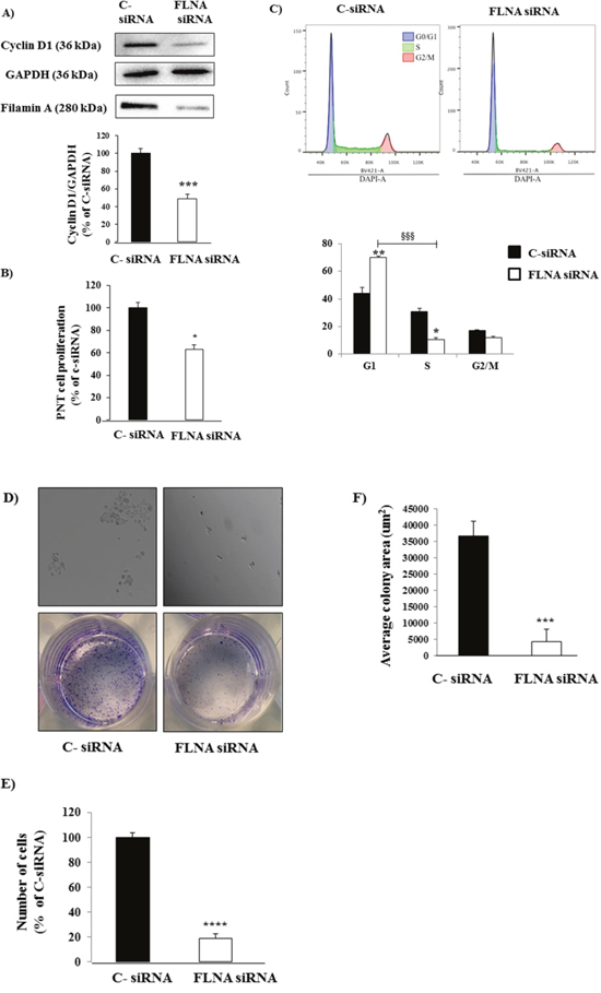 Figure 2: FLNA silencing reduced PNT cell proliferation and colony formation. (A) Representative immunoblotting performed with antibodies raised against Cyclin D1. FLNA knock down induced a significant decrease in Cyclin D1 levels in primary PNT cells. The equal amount of protein was confirmed by stripping and reprobing with an anti-GAPDH antibody. The graph shows the quantification of Cyclin D1 normalized to GAPDH. Data represent mean ± SD of three independent experiments.*** =p<0.001 vs C- siRNA. (B) After FLNA silencing, we measured cell proliferation in primary PNTs cells incubated with BrdU for 24 h. Experiments were repeated 3 times and each determination was done in triplicate. Values represent mean (±SD) * =p<0.05 vs C- siRNA. (C) Cell cycle analysis by DNA content of H727 cells treated with C- siRNA or FLNA siRNA. H727 cell line were fixed and processed according to the DAPI labelling protocol listed on material and method. Single cells were gated via DAPI width and area signals to calculate G1, S phase, G2/M from a DAPI area histogram. Left panel represent H727 cells treated with C- siRNA, right panel represent H727 cells treated with FLNA siRNA. The graph shows the quantification of data from two independent experiments. Values represent mean (±SD) * =p<0.05, ** =p<0.01, §§§ =0.001. (D) FLNA silencing strongly decreased quantity of colonies. Microscopyimages (top panels) show H727 cells incubated with C-siRNA and FLNA siRNA after 7 days. Images of the cell colony assay stained with a solution containing 0.05% crystal violet (bottom panels). (E) To count numbers of cells, after 7 days H727 cells were incubated with cell quantification solution and absorbance was measured at 490 nm. Graph shows that FLNA silencing significantly decreased number of H727 cells with respect to C-siRNA cells. Values represent mean ±SD of 3 experiments. ****=p<0.0001 vs corresponding basal. (F) To measure colony surface area, 3-4 fields were randomly selected in each well. Average of colony area (μm2) was measured using the software ImageJ. ***=p<0.001 vs corresponding basal. Experiments were repeated at least 3 times. Statistical analysis was performed with t-test.