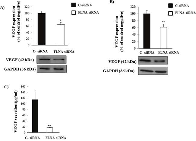 Figure 3: Effect of FLNA on VEGF expression and in vitro release in H727 cells. (A&B) Representative immunoblot of VEGF demonstrates that FLNA silencing reduces VEGF expression in primary PNTs cells and H727 cells, respectively. The graph shows the ratio of VEGF/GAPDH normalized to C- siRNA. Experiments were repeated at least 2-3 times. *p<0.05, **p<0.01 vs C- siRNA. (C) ELISA analysis of VEGF release in supernatant by c-siRNA and FLNA siRNA H727 cells. All data are expressed as mean ± SD of three independent experiments. **=p <0.01, **=p<0.01 vs C- siRNA.
