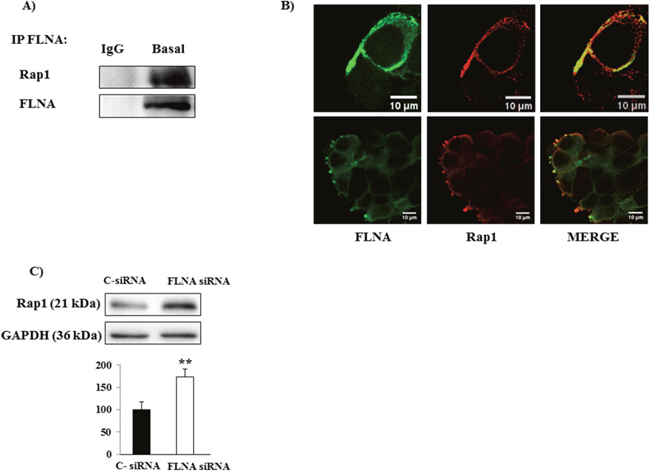 Figure 4: (A) Representative Immunoblot image shows thatFLNA interacts with Rap1. H727 lysate was immunoprecipitated with FLNA antibody or normal mouse IgG and the presence of Rap1 was detected using anti-Rap1 antibody. The presence of equal amounts of FLNA in the immunoprecipitates was confirmed by stripping and reprobing with anti-FLNA. As negative control, normal mouse IgG was used for the immunoprecipitation (IP). (B) Representative confocal microscopy images of fixed H727 cells stained for FLNA (green) and Rap1 (red). The results shown are representative images of three individual experiments. Scale bar 10 μm. (C) Representative immunoblots of Rap1 expression in H727 cells transfected with C-siRNA or FLNA siRNA. The graph shows the ratio of Rap1/GAPDH normalized to C-siRNA (mean value ±SD from 3 independent experiments). **=p<0.01 vs C- siRNA.