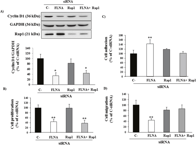 Figure 5: FLNA effect on cell proliferation, adhesion and cell migration and Rap1 involvement. (A) FLNA siRNA-treated cells showed a strong decrease in Cyclin D1 expression and cell proliferation in H727 cells not via Rap1. H727 cells were transfected with control siRNA, FLNA siRNA alone or together with Rap1 siRNA. The graph shows the quantification of Cyclin D1 normalized to GAPDH. Data represent mean ± SD of three independent experiments. One-way ANOVA; Bonferroni post test * =p<0.05 vs C- siRNA. (B) The graph shows BrdU incorporation during DNA synthesis in H727 cells transfected with C-siRNA, FLNA siRNA alone or together with Rap1 siRNA. Data represent mean ± SD of three independent experiments. One-way ANOVA; Bonferroni post test **=p<0.01 vs C- siRNA. (C) H727 cells transfected with C-siRNA or FLNA siRNA alone or together with Rap1 siRNA were incubated in complete medium for 90 min at 37°C. Experiments carried out in H727 cells were repeated at least 4 times. The graph shows the quantification of adherent cells. Values represent mean (±SD). One-way ANOVA; Bonferroni post test **=p<0.01 vs C-siRNA. (D) H727 cells transfected with C-siRNA, FLNA siRNA alone or together with Rap1 were incubated for 24 h with serum-free medium. Migratory cells were quantified by fluorometric plate reader. Experiments were performed in triplicate 3 times. Values represent mean (±SD); One-way ANOVA; Bonferroni post test **=p<0.01 vs C-siRNA.
