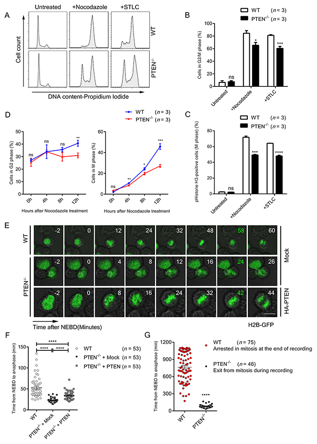 Figure 1: PTEN maintains SAC timing. (A) FACS profiles of Propidium Iodide (PI) stained WT and PTEN-/- HCT116 cells. Cells were treated with indicated spindle poison for 12 hours. (B) Flow cytometry analysis of WT and PTEN-/- HCT116 cell cycle. Cells were treated with indicated spindle poison for 12 hours before FACS assay. Percentage of G2/M phase cells was analyzed from FACS profiles fitted with the “Dean-Jett-Fox” model. n, number of independent FACS assays (~10 000 cells were analyzed each time). (C) FACS profiles of pHistone-H3 labeled (M phase) WT and PTEN-/- HCT116 cells. Cells were treated with indicated spindle poison for 12 hours and labeled with pHistone-H3. n, number of independent FACS assays (~10 000 cells were analyzed each time). (D) FACS profiles of G2 and M phase for WT and PTEN-/- HCT116 cells. Cells were treated with nocodazole, collected at indicated time points and labeled with pHistone-H3 and PI. Percentage of cells in G2 phase and M phase were analyzed as described in B, C. n, the number of independent FACS assays (~10 000 cells were analyzed each time). (E) Live cell imaging of WT and PTEN-/- HCT116 cells. Cells expressing H2B-GFP were tracked during unperturbed mitosis. Time ‘0’ denotes NEBD. Time marked in green denotes anaphase onset. Scale bars, 10 μm. (F) – (G) Statistical analysis of SAC timing. The interval from NEBD to anaphase was determined with time-lapse recordings after GFP-H2B transfection of indicated cells. Cells were treated with nocodazole before recording in G. n, number of mitotic cells counted. Values in B, C, D represent mean ± SD, and values in F represent mean ± SEM. Statistical significance was determined by unpaired t-test, ns denotes non-significant, *P<0.05, **P<0.01, ***P<0.001, ****P<0.0001. See also Supplementary Figure 1.