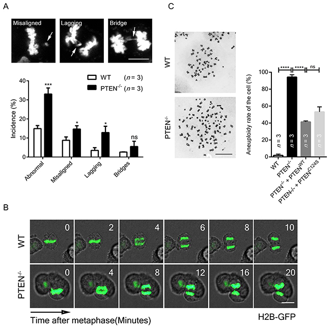 To determine whether mitosis was impaired in the absence of PTEN, abnormal chromosome incidences were visualized by immunofluorescence, and severe chromosome mis-segregation was found in metaphase and anaphase (Figure 2A, top panel). Significant increases in chromosome misalignment, lagging and bridging were also identified by statistical analysis (Figure 2A, lower panel), which is consistent with the finding that PTEN-/- cells displayed a longer anaphase than normal cells (Figure 2B).