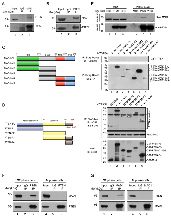 Figure 3: PTEN interacts with MAD1 in interphase. (A) – (B) Immunoprecipitation of PTEN and MAD1. PTEN or MAD1 was immunoprecipitated from HCT116 cell extracts and immunoblotted for MAD1 or PTEN. IgG, immunoglobulin G. (C) In vitro binding assay. Left panel, overview of MAD1 and its truncations. Right panel, S-HA tagged MAD1 and its truncations were pulled down with S-tag beads, and tested for binding to purified GST-PTEN. (D) In vitro pull-down assay. Left panel, overview of PTEN and PTEN truncations. FLAG tagged MAD1 was pulled down with FLAG-beads, and tested for binding to purified GST-Mock, GST tagged PTEN and related truncations. Number on each PTEN truncation band denotes its relative intensity ratio compared to the input band, which indicates its binding ability with MAD1. The asterisk designates a non-specific band of GST antibody. (E) S tag pull down analysis. Exogenous S-HA-PTEN and FLAG-MAD1 were transfected into HCT116 cells. PTEN was pulled down by S-tag beads and detected with a FLAG antibody for MAD1 with or without nocodazole treatment. Mock, S-HA tagged mock protein. (F) – (G) Conditional immunoprecipitation of PTEN and MAD1. G2 phase cells were acquired after 12 hours of thymidine block and 8 hours of release, M phase cells were acquired by mitotic shake off after 12 hours of nocodazole treatment. PTEN or MAD1 was immune precipitated from G2 or M HCT116 cells and immunoblotted for MAD1 or PTEN. IgG, immunoglobulin G. See also Supplementary Figures 2 and 3.