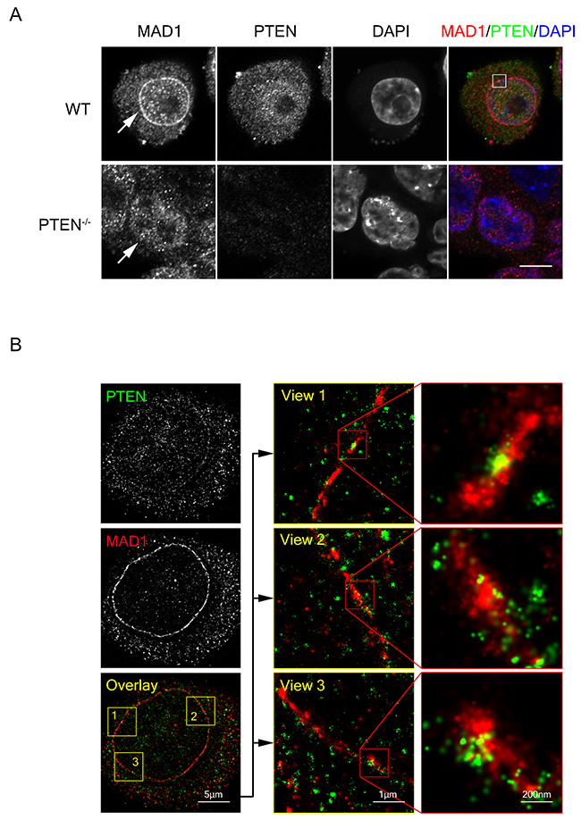 Figure 4: PTEN co-localizes with MAD1 at the nuclear envelope. (A) Immuno-fluorescence staining of fixed WT and PTEN-/-HCT116 cells. Cells were stained for MAD1 (red), PTEN (green) and DNA (blue). Single z sections are shown with scale bars in 10 μm. White square denotes co-localization point of MAD1 and PTEN. White arrows denote nuclear envelope localization of MAD1. (B) STORM super resolution image of PTEN and MAD1. Fixed HCT116 cells were stained for PTEN (green) and MAD1 (red). Single z sections of co-localization views are shown. PTEN exhibited a circle pattern similar to MAD1. See also Supplementary Figures 4 and 5.