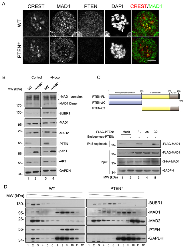 PTEN is recognized as an important tumor suppressor. In addition to its well-characterized regulation of cell survival, PTEN is also involved in global maintenance of genome stability [10–13]. To gain insight into additional mechanisms which underlie PTEN protection of the genome, we investigated the PTEN function in protection of SAC timing. Chromosome instability in Pten null MEFs is phenotypically similar to that seen in Mad1 depletion [14]. This observation caught our attention, and raised the possibility that PTEN participates in MAD1 related preservation of chromosome integrity.