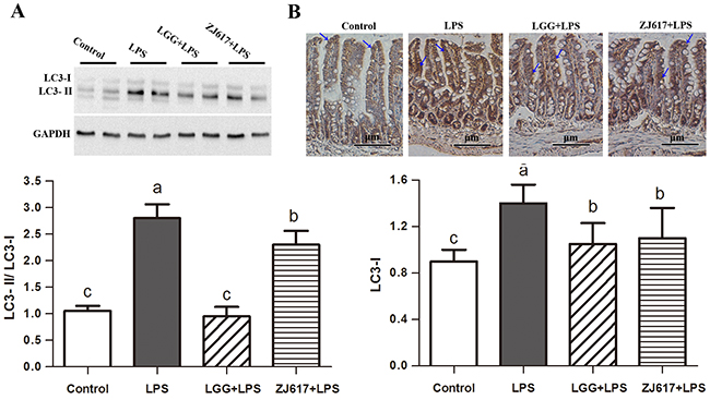 Figure 7: Effect of Lactobacillus rhamnosus GG (LGG) and Lactobacillus reuteri ZJ617 (ZJ617) on intestinal autophagy in mice challenged with LPS. Mice were orally inoculated with lactobacilli for 7 days before the challenge with an intraperitoneal injection of 10 mg/kg LPS. Ileal tissues from six mice in each group were obtained 24 h after injection. (A) Immunoblotting of and quantitative analysis of ileal microtubule-associated light chain 3 (LC3). The protein bands were quantified by densitometry analysis, normalized to GAPDH. The values are expressed as means ± SD (n = 6). (B) Immunohistochemistry of and quantitative analysis of ileal LC3. Brown staining indicates LC3 positive cells. The ratio of positive-stained cells/all cells is expressed as the mean ± SD (n= 6). Different alphabet indicates significance (P < 0.05).