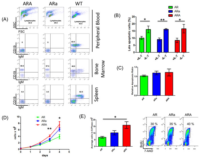Compared to WT mice, ARA and ARa mice showed an accumulation of CD19+ IgM- pro-B cells in the bone marrow (Figure 4A). To analyze whether Aid deficiency influences the pro-B cell population in young and healthy AR, ARa and ARA mice, B220+ BM B-cells from the respective backgrounds were sorted and cultured in vitro. Since the importance of the IL-7 signaling was highlighted in the somatic mutational spectrum, IL-7 sensitivity assays were performed. Thereby BM pro-B cells of healthy AR, ARa and ARA mice showed significant apoptosis induction (Figure 4B) (AR p = 0.0444, Ara p = 0.0049, ARA p = 0.05; student’s t-test) while differences in IL-7 sensitivity could not be observed between the groups after 24 hours of IL-7 withdrawal (Figure 4C). These results emphasize the strong IL-7 dependency of the Rag1 negative pro-B cells, which interfered with the in vitro simulation of a potential Aid induction in the absence of IL-7 [8]. In this regard, Aicda transcripts were not detectable at 24 or 48 hours after IL-7 depletion in either AR or ARa healthy pro-B cells, even in the presence of LPS as infectious stimulus (data not shown). Nevertheless, the proliferation rate of healthy ARA B220+ B-cells was significantly higher (day 3 p = 0.0098, day4 p = 0.0244) compared to AR B220+ B-cells (Figure 4D). This observation extends the findings of Kuraoka et al. [21], stating that Aicda-/- progenitors exhibit a significant advantage in the production of immature and mature B-cell compartments. This proliferative increase was further validated by BrdU assays, showing enhanced accumulation of ARA pro-B cells (p = 0.0318, student’s t-test; AR = 26.8±4.8%, ARa = 33.4±9.2%, ARA = 38.5±12.2%) in the DNA synthesis phase (S-phase) (Figure 4E and Supplementary Figure 4E). Since the analyzed pro-B cells are highly IL-7 dependent, we were unable to investigate the observed results with regard to Aid induction in the absence of IL-7.