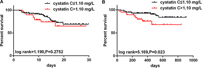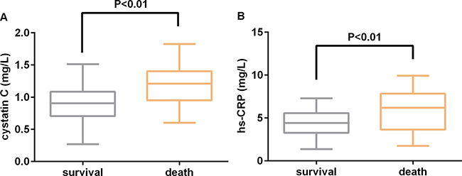 Continuous variables were presented as mean ± standard deviation (SD) or median and interquartile range, and categorical variables were displayed as counts or percentages. Student’s t-test or Mann-Whitney test was used for the analysis of continuous variables and χ2-test for categorical variables. The correlation between cystatin C and hs-CRP was determined by the spearman rank correlation. Short- and long-term outcomes were determined using the Kaplan-Meier method and compared using the log-rank test. A logistic regression model was constructed for the multivariable analysis for markers, and cystatin C + hs-CRP (cystatin C + hs-CRP = −8.40 + 0.62* hs-CRP + 0.45* cystatin C) was then generated. Receiver operating characteristic (ROC) analysis was used to compare the prognostic value of cystatin C and D-dimer. SPSS 19.0 (SPSS Inc, Chicago, IL) and GraphPad Prism 6.5 (GraphPad Software Inc., CA) were used to perform statistical analysis. P value < 0.05 was considered statistically significant.